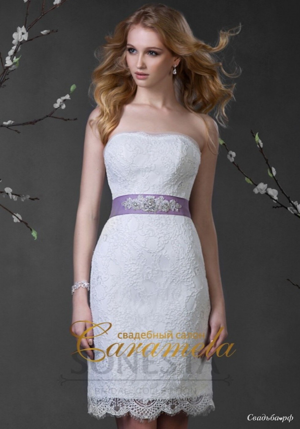 Короткое свадебное платье на корсете из кружева, с поясом, который великолепно подчеркивает талию.