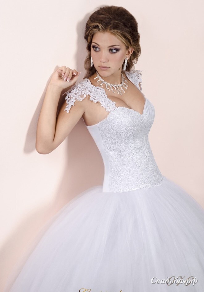 Роскошное свадебное платье с открытой зоной декольте и кружевными лямками создано для настоящих принцесс. Элегантный корсет подчеркивает талию. Пышная юбка из нескольких слоёв невесомой ткани придаёт образу невероятную лёгкость.
