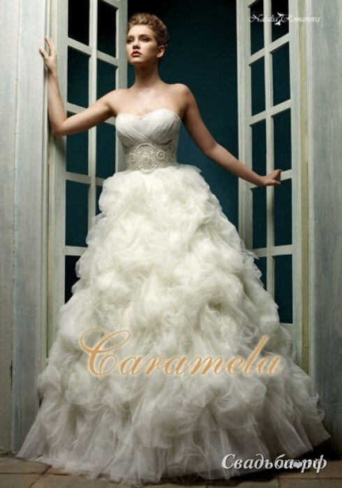 Оригинальная трактовка классической модели свадебного платья с пышной многослойной юбкой с оборками и открытым облегающим топом, украшенным изящной вышивкой ручной работы и изысканным каскадом из струящейся тафты. Открытые плечи и руки, умеренное декольте.