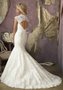 Свадебное кружевное платье силуэта «Русалочка», облегая фигуру и расширяясь от уровня бедра, прекрасно подчеркивает обворожительные формы. Открытый вырез на спине необычной формы, несомненно, привлечет восторженные взгляды. Ажурное миниатюрное болеро изящно украсит плечи невесты, а длинный шлейф с кружевными узорами придаст облику легкости.