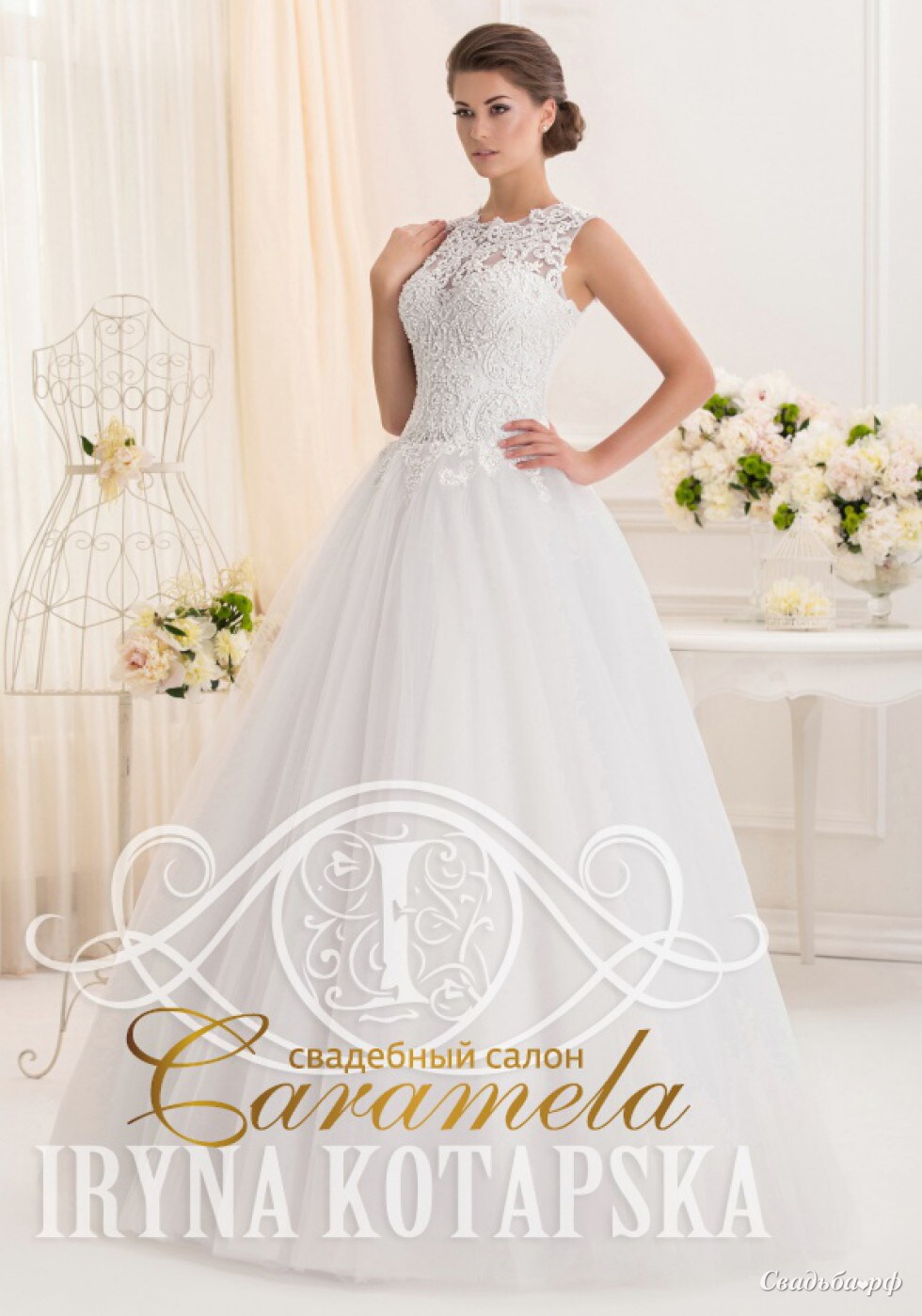 Роскошное свадебное платье с кружевным верхом. Нежное кружево полностью окутывает строгий лиф модели, кокетливо прикрывает зону декольте и формирует соблазнительный вырез на спинке. Пышная юбка лёгким облачком колышется вокруг ножек невесты. Сзади расположена удобная шнуровка, с помощью которой можно легко отрегулировать ширину модели.