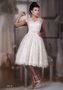 Короткое свадебное платье выполнено в стиле ретро. Эта очаровательная кружевная модель дополнена игривым бантом сзади. Широкие кружевные бретели прикрывают плечи и придают особую трогательность образу. Талия подчёркнута поясом. Пышная юбочка с ажурной окантовкой прикрывает слегка колени, благодаря чему Вы сможете щегольнуть своими ножками.