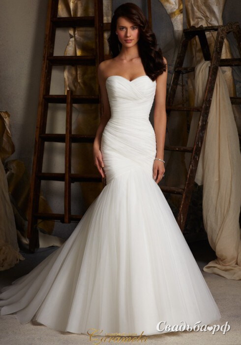 Элегантное свадебное платье силуэта Русалочка мягко скроет недостатки фигуры и выгодно подчеркнёт её достоинства. Верхняя часть наряда дополнена тонкой драпировкой. Открытая зона декольте приковывает взгляды к бюсту. От середины бедра начинается пышная юбочка из лёгкой ткани. В таком платье от американских дизайнеров Вы будете на высоте!