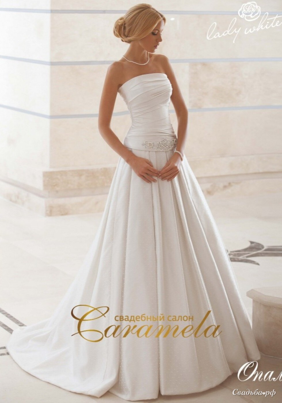 Атласное платье А-силуэта с заниженным корсетом красиво подчеркнет талию, а расшитый пояс придаст роскоши.