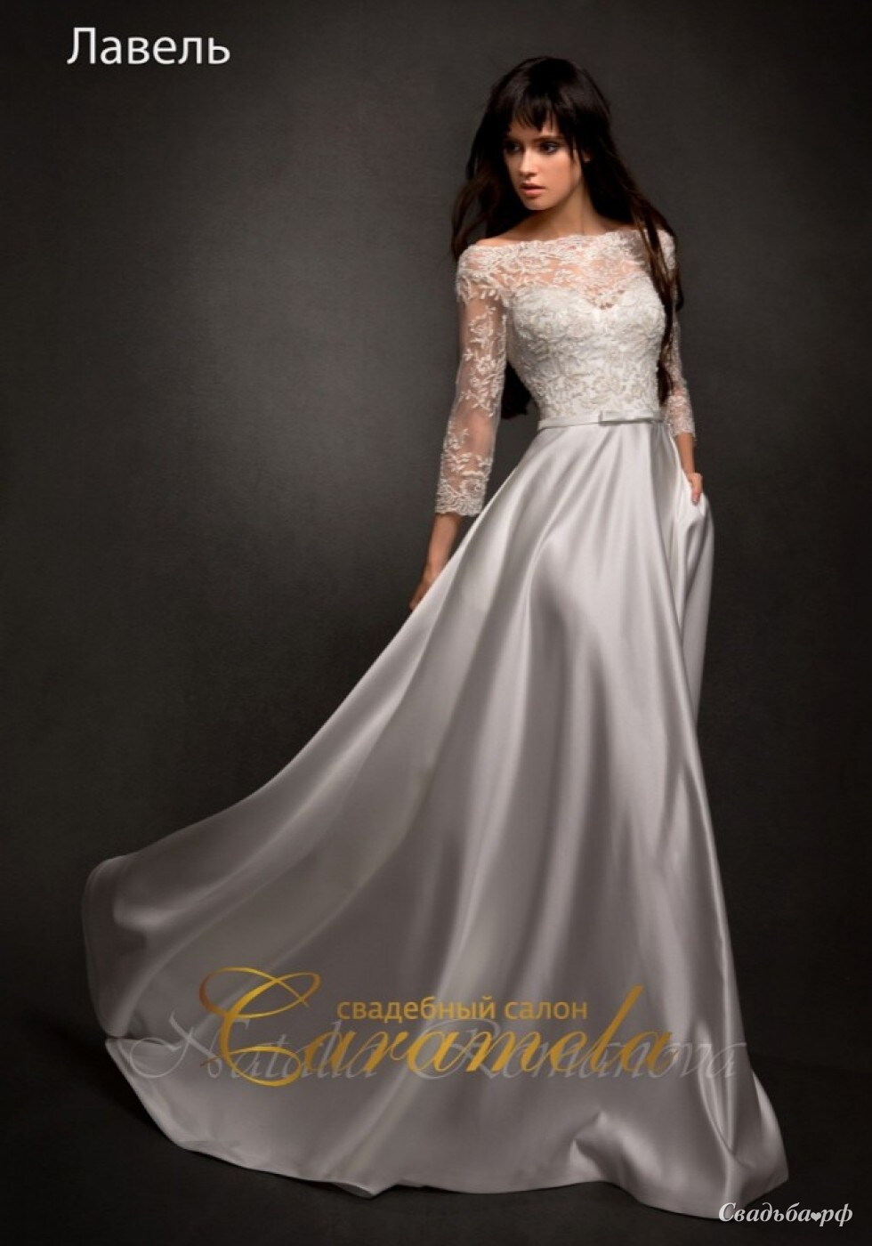 Закрытое свадебное платье с прямой облегченной атласной юбкой.