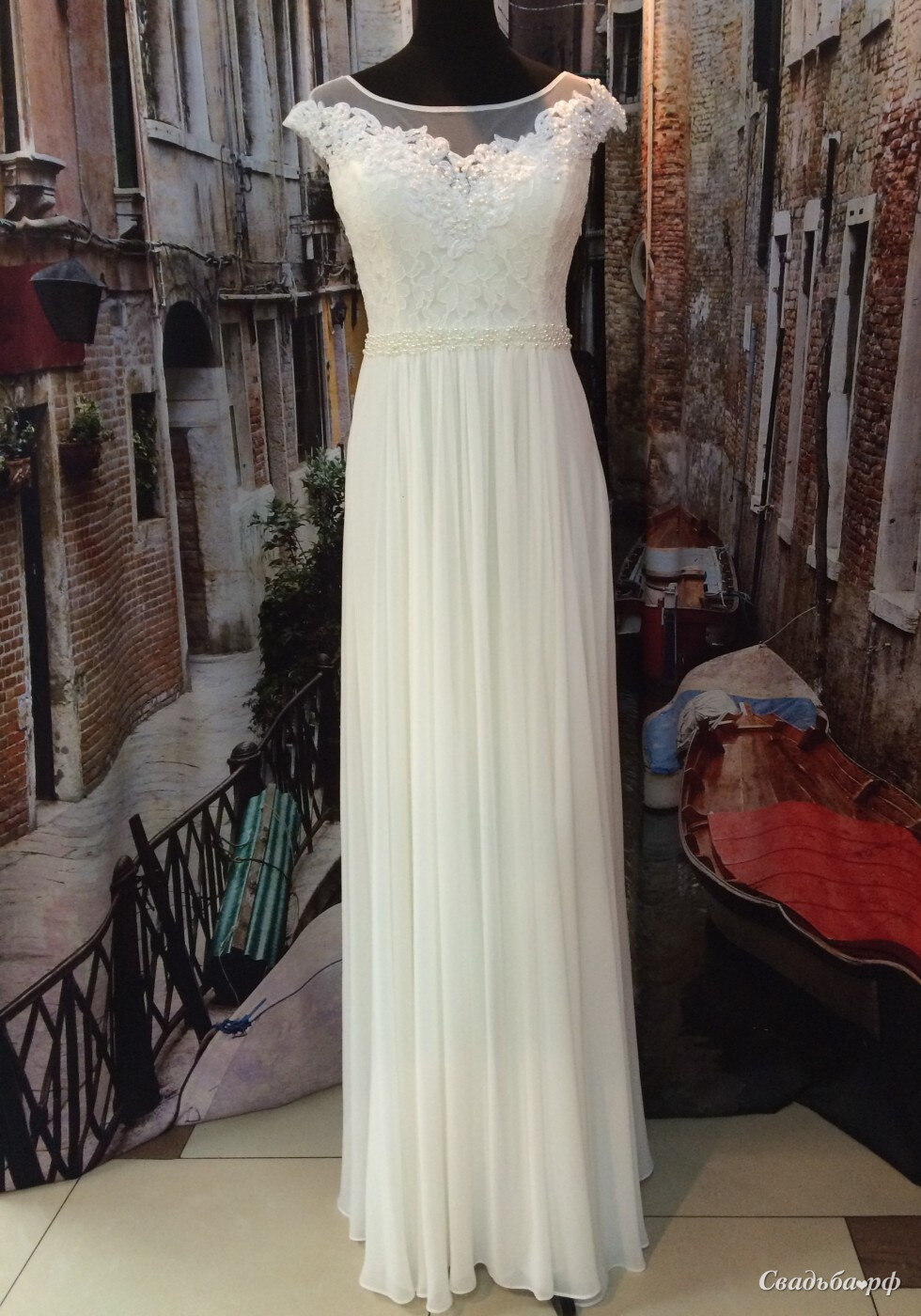 Нежная модель из шифона, с прямой юбкой и закрытыми плечами и зоной декольте. Роскошная кружевная спинка делает модель неповторимой и элегантной.
