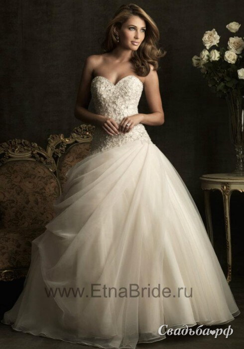 Роскошное свадебное платье с заниженным корсетом. Верх расшит кристаллами Swarovski. Пышная юбка из невесомой ткани дополнена объёмными сборками, придающими наряду ещё большую лёгкость и воздушность. Юбка переходит в королевский шлейф. Пикантно оголённая зона декольте привлекает внимание. Ещё больше моделей на нашем сайте www.EtnaBride.ru.