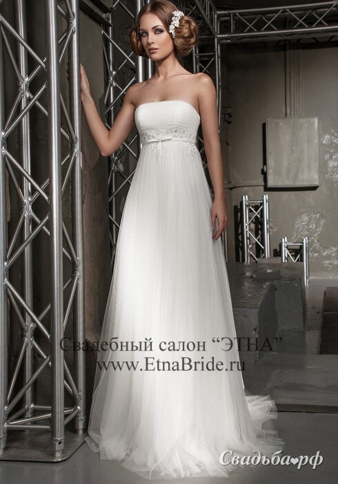 Необычайно легкое и воздушное свадебное платье. Открытый прямой лиф эффектно подчёркивает соблазнительную округлость женской груди. Завышенная линия талии задекорирована красивой вышивкой и тонким атласным пояском с бантиком. Юбка – мягкая, струящаяся. Наличие нужного размера уточняйте по телефонам салона ЭТНА. Наш сайт www.EtnaBride.ru