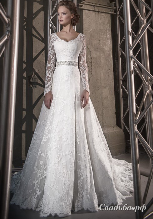 Свадебное платье с рукавами. Платье выполнено из тонкой кружевной ткани. Ширина строгого корсета регулируется шнуровкой. Линия талии выделена широким поясом, расшитым крупными стразами. Сзади расположен большой атласный бант и элегантный кружевной шлейф. Наличие нужного размера уточняйте по телефонам салона ЭТНА. Наш сайт www.EtnaBride.ru