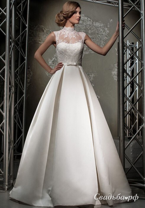 Закрытое свадебное платье с атласной юбкой. Корсет модели обтянут изысканным кружевом с красивыми ажурными узорами. Сзади вдоль спинки расположен ряд крохотных жемчужных пуговичек. Линия талии выделена узким пояском с бантиком. Воротник-стоечку можно убрать. Наличие нужного размера уточняйте по телефонам салона ЭТНА. Наш сайт www.EtnaBride.ru