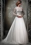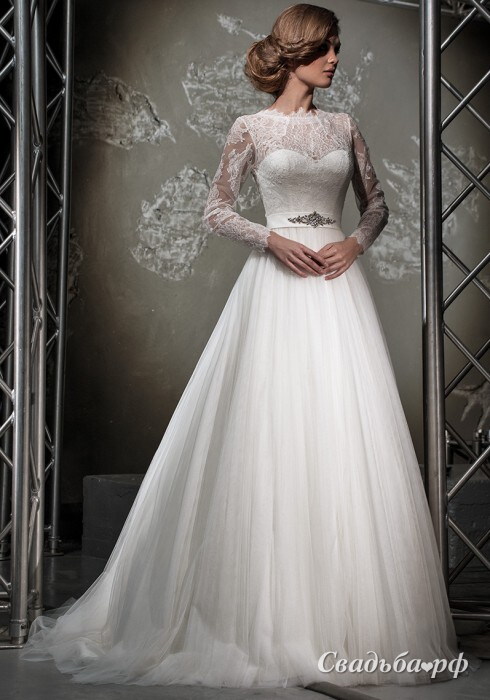 Закрытое свадебное платье из нежного кружева. Ажурные узоры кокетливо выступают за контуры округлого выреза и эффектно подчёркивают изящество шеи. Линия талии выделена широким атласным поясом с композицией из сверкающих стразов. Вдоль спинки – ряд пуговичек. Наличие нужного размера уточняйте по телефонам салона ЭТНА. Наш сайт www.EtnaBride.ru
