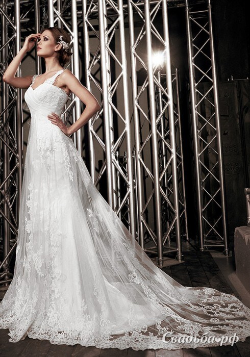 Очень интересное платье со шлейфом. Мягкая драпировка из гладкой ткани и изысканное кружево с красивыми цветочными узорами искусно соединяются и формируют фигурный лиф. Широкие кружевные бретели кокетливо прикрывают плечи. Юбка спокойно струится вдоль фигуры. Наличие нужного размера уточняйте по телефонам салона ЭТНА. Наш сайт www.EtnaBride.ru