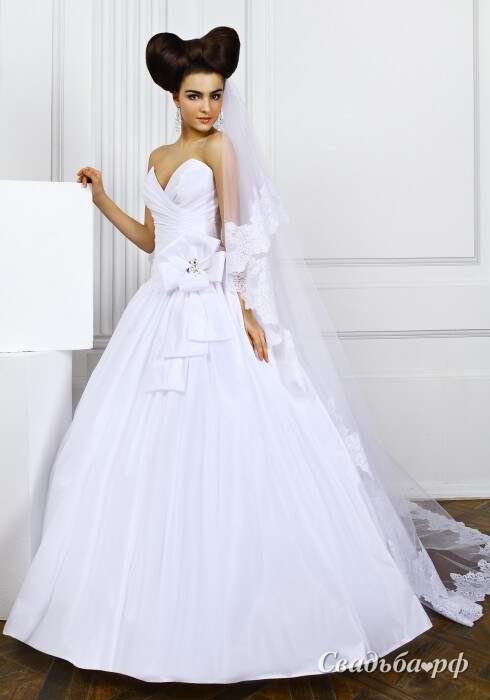 Стильное свадебное платье с оригинальным фигурным лифом. Корсет модели украшен изысканной мягкой драпировкой. Широкая пышная длинная юбка похожа на колокольчик, который игриво колышется вокруг стройных ножек невесты. На боку расположена оригинальная композиция из ткани. Скидка по акции Последний размер! Подробнее на сайте www.EtnaBride.ru
