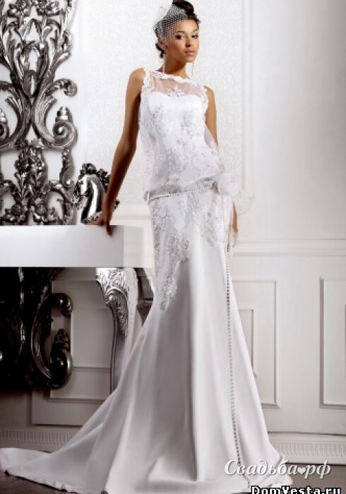 Невероятно женственная модель свадебного платья ретро-стиля. Корсет платья, верхняя часть юбки и зона декольте закрыты изысканными кружевами. Оригинальность наряду придает жемчужная нить, охватывающая талию и спускающаяся по юбке до самого низа. Вы почувствуете себя стильной богиней!