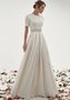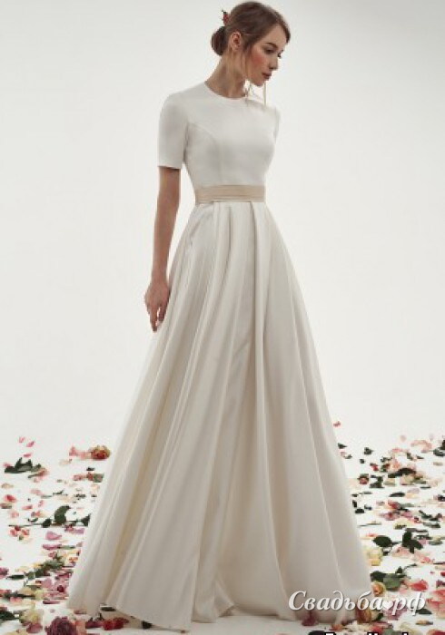 Нежное изящное свадебное платье для романтичной принцессы. Его особенность — необычный атласный закрытый верх, который контрастирует с простой юбкой из шелковой тафты за счет разницы фактур. Контрастный пояс на талии придает модели особую утонченность.