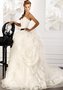 Роскошное свадебное платье без бретелей с вырезом на лифе в форме сердечка. Корсет задрапирован широкими складками, идущими крест-накрест. Черный пояс украшает талию. Пышная юбка из органзы затейливыми ярусами спадает до самого пола и переходит в длинный шлейф.