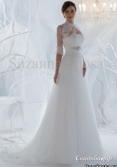 Очень нежное свадебное платье из фатина. Корсет украшен кружевом. Под грудью расшивка из бусин и страз Сваровски. Длинная мягкая юбка плавно переходит в великолепный шлейф. Особенно эффектно модель смотрится в сочетании с элегантным кружевным болеро с рукавом ?, сквозь ажурные узоры которого соблазнительно просвечивается нежная кожа плеч и рук.