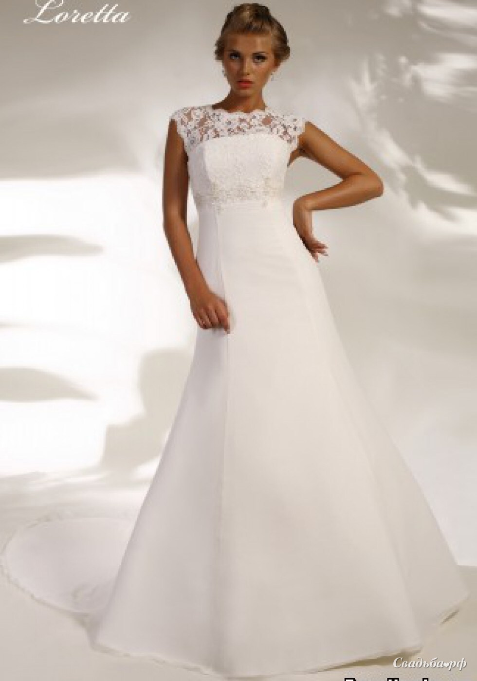 Свадебное платье в стиле годе с закрытым кружевным верхом. Корсет и верх платья украшены кружевом. Под грудью расшивка из жемчуга и бисера. Спина слегка приоткрыта.