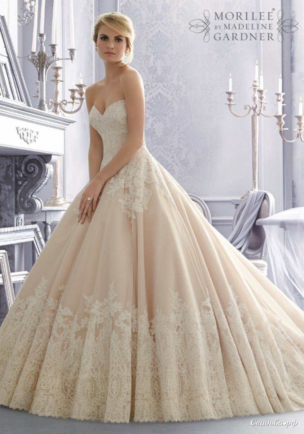 Чудесное свадебное платье в пышном стиле придется по вкусу нежным девушкам. Корсет платья с вырезом в форме сердечка украшен аппликацией из французских кружев. Спинка декорирована маленькими пуговками. Пышная юбка расшита кружевами по подолу, придавая образу в целом романтичность и скромность.
