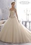 Невероятно красивое пышное свадебное платье со шлейфом с заниженной талией. Корсет дополнен полупрозрачными маленькими рукавчиками и полностью расшит жемчугом, стеклярусом, бисером и камнями Сваровски. На спинке круглый вырез и маленькие пуговки. Простая пышная юбка из многослойного фатина переходит в шлейф.