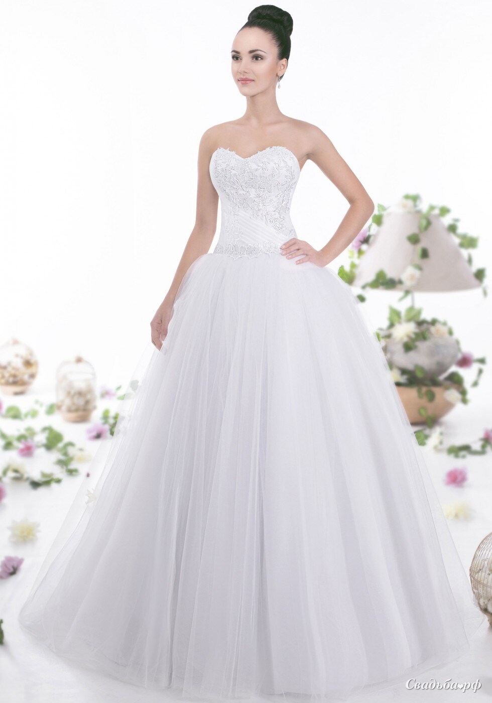 Умопомрачительное свадебное платье с заниженным корсетом и пышной юбкой. Корсет с сердцевидным вырезом украшен цветочной кружевной аппликацией со стразами и плиссированной вставкой, великолепно подчеркивает фигуру. Фантастическая юбка из фатина добавляет образу воздушность и легкость. Этот наряд для девушек, желающих воплотить сказку в реальность.