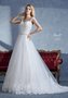 Шикарное свадебное платье А-силуэта со шлейфом с богато украшенным корсетом и легкой юбкой. Корсет дополнен широкими бретелями и расшит кружевом. На спинке глубокий V-образный вырез. Талия подчеркнута вышивкой из страз и бисера. Легкая юбка из фатина создает воздушный образ принцессы. Юбка по подолу декорирована кружевами. Этот наряд создан для нежного образа невесты.