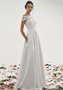 Прямое свадебное платье из кружева и тафты в элегантном стиле. Закрытый лиф с короткими рукавами украшен крупными изящными узорами из кружева. Непышная юбка с тонким поясом на талии стройнит и вытягивает фигуру.