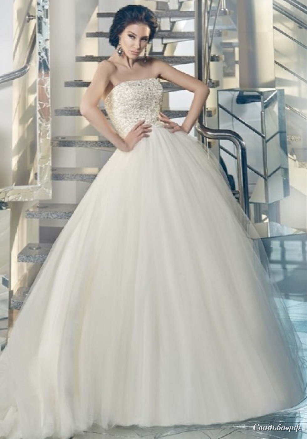 Шикарное свадебное платье с пышной фатиновой юбкой. Корсет расшит затейливой вышивкой из стекляруса, бисера и камней Сваровски. Спинка и юбка со шлейфом декорированы маленькими атласными пуговками. Объемная юбка из многослойного фатина завершает образ принцессы.