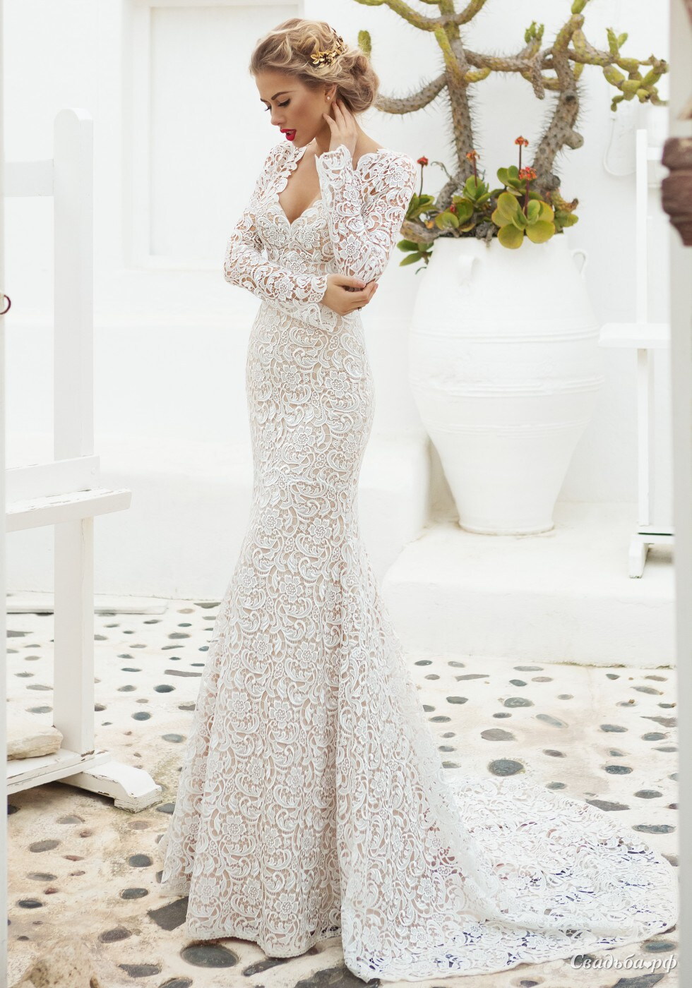 Удивительно нежное свадебное платье поможет создать образ прекрасного пленительного ангела. Полупрозрачные длинные кружевные рукава, глубокое декольте и открытая спинка придают модели особый шик. Длинная облегающая юбка струится до пола и переходит в шлейф.