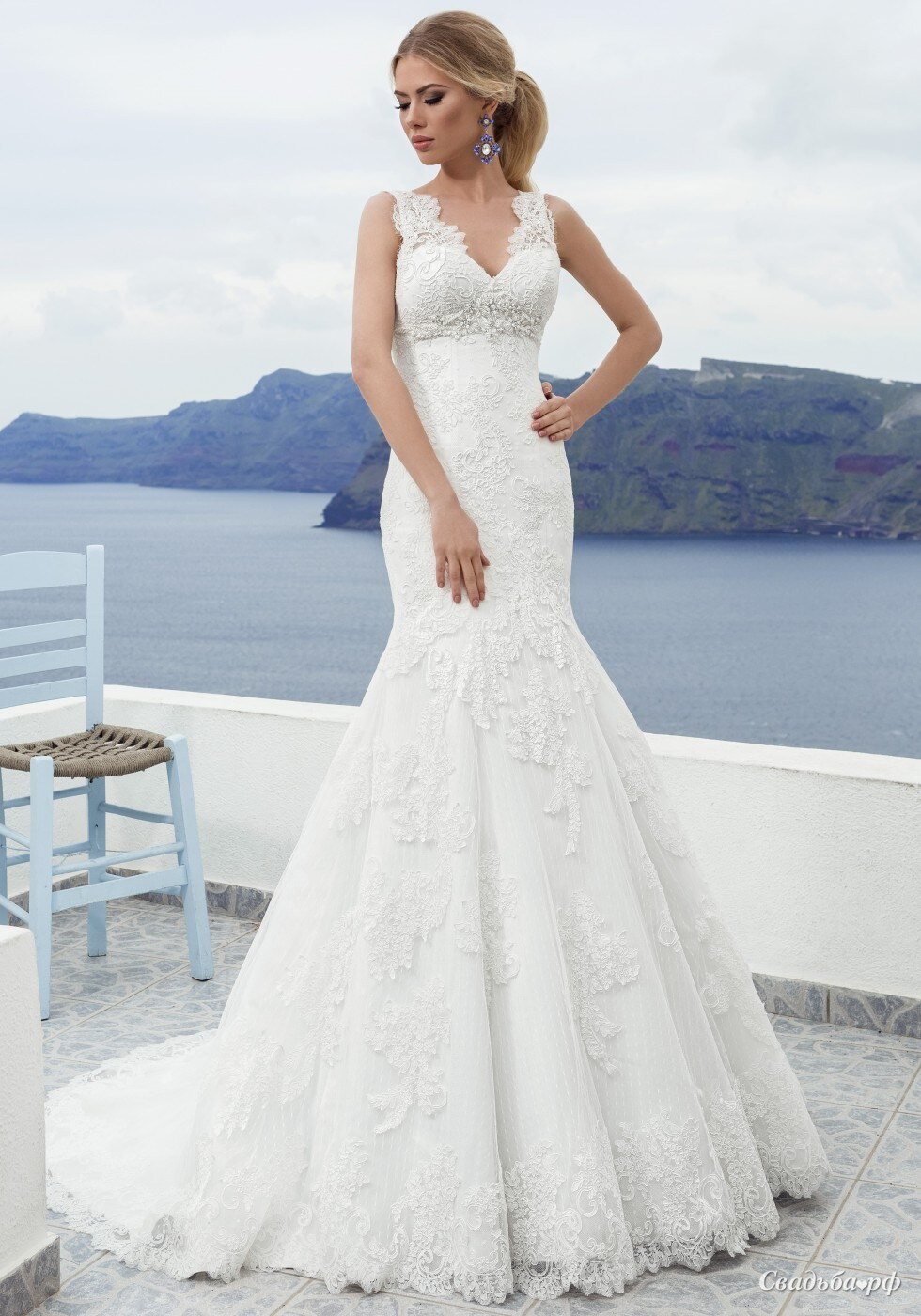 Поистине королевское кружевное свадебное платье с широкими бретелями в стиле рыбка. Модель с сердцевидным лифом зрительно увеличивает грудь. Облегающий силуэт эффектно подчёркивает фигуру. Расклешенная от середины бедра юбка струится до самого пола. В этом наряде невеста будет неотразимой в самый торжественный день своей жизни.