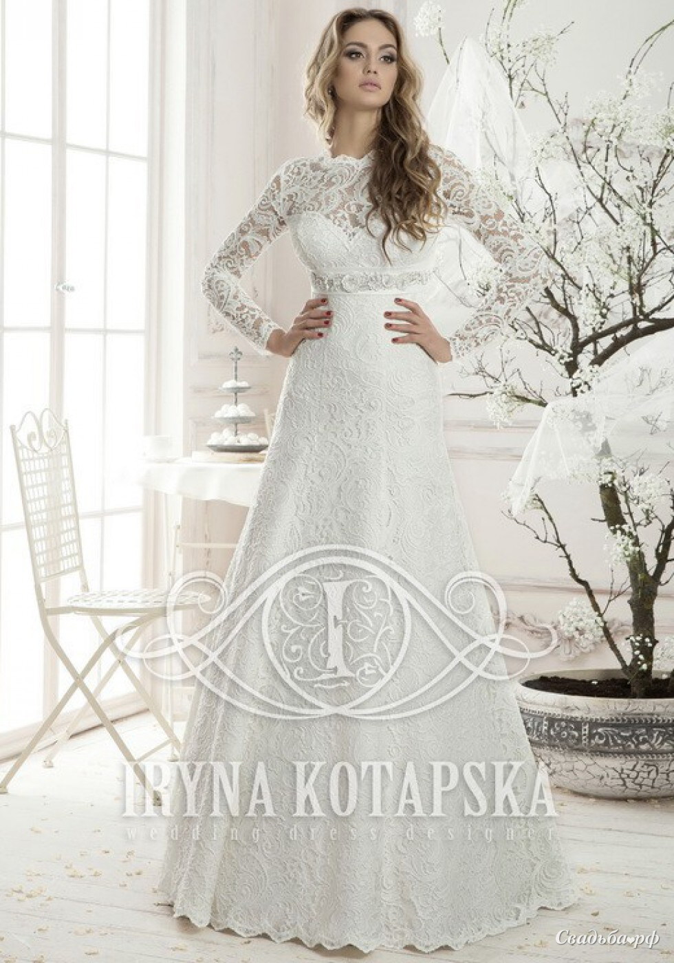 Элегантное кружевное свадебное платье А-силуэта понравится истинной леди. Модель не перегружена декором и отличается безупречностью кроя. Корсет дополнен закрытой зоной декольте и длинными полупрозрачными рукавами. Широкий пояс под грудью вручную расшит стразами Сваровски. Наряд идеально садится по фигуре и подчёркивает её достоинства. Юбка струится до самого пола.