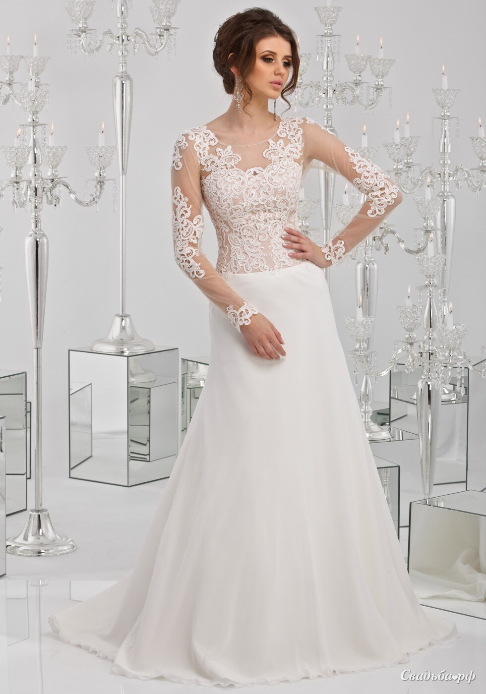 Нежное свадебное платье с объёмным кружевом на корсете выгодно расставляет акценты фигуры. Лиф дополнен длинными прозрачными рукавами. На спинке треугольный вырез. Оригинально украшенный корсет зрительно уменьшает талию. Длинная юбка поможет Вам выглядеть выше и стройнее. Наряд не перегружен излишним декором.