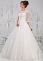 Роскошное свадебное платье идеально сочетает в себе стиль и нежность. В этом наряде любая невеста будет выглядеть как настоящая королева. Лиф дополнен полупрозрачными рукавами до локтя и украшен кружевами. Спинка закрыта и декорирована маленькими пуговками. Длинная юбка с мягкими складками переходит в шлейф.