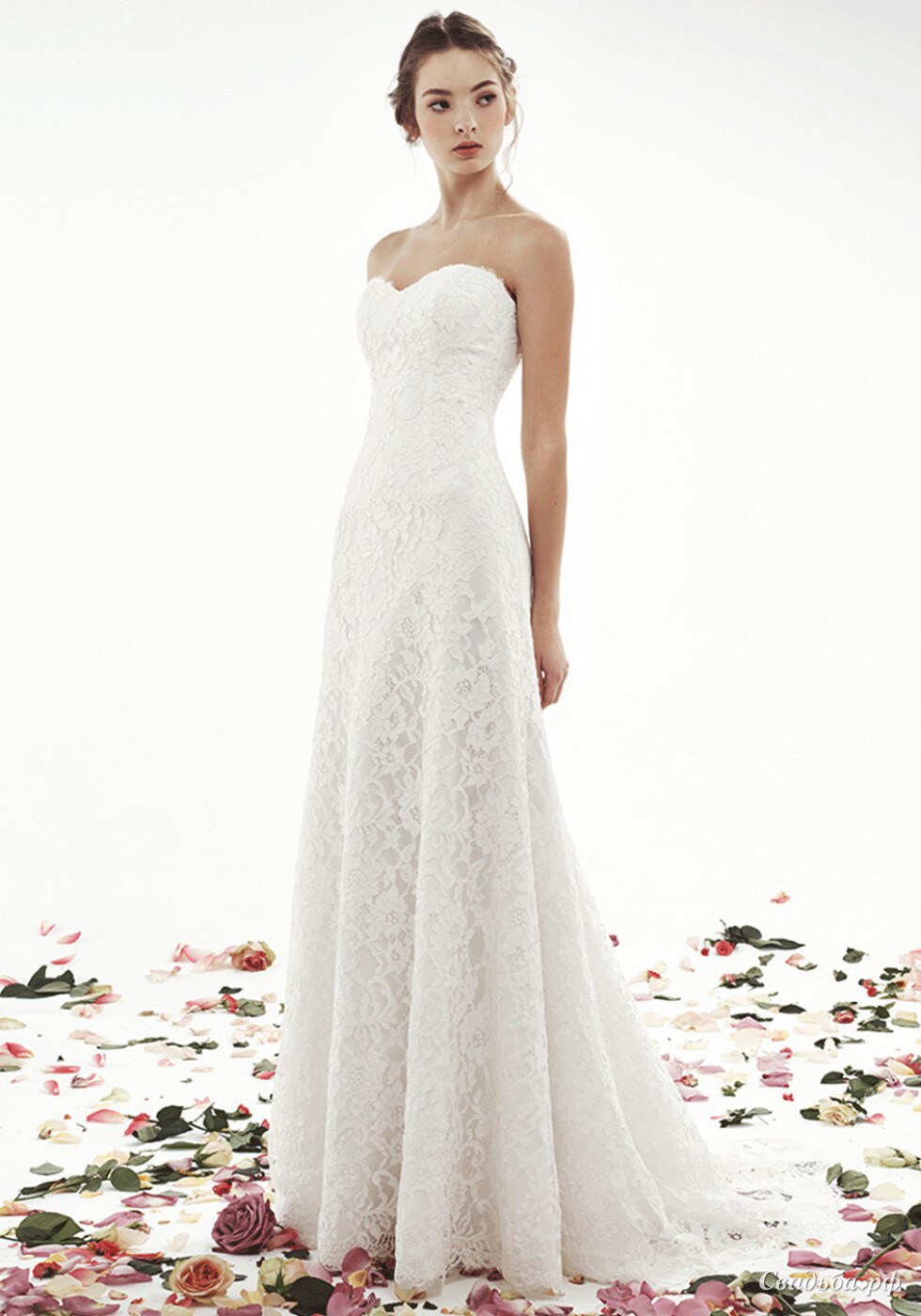 Элегантное свадебное платье из кружева в аристократическом стиле для невест, предпочитающих классику. Нежная фактурная ткань придает этому наряду роскошное изящество. Прямая длинная юбка визуально вытягивает фигуру, и модель будет прекрасно смотреться на невестах небольшого роста.