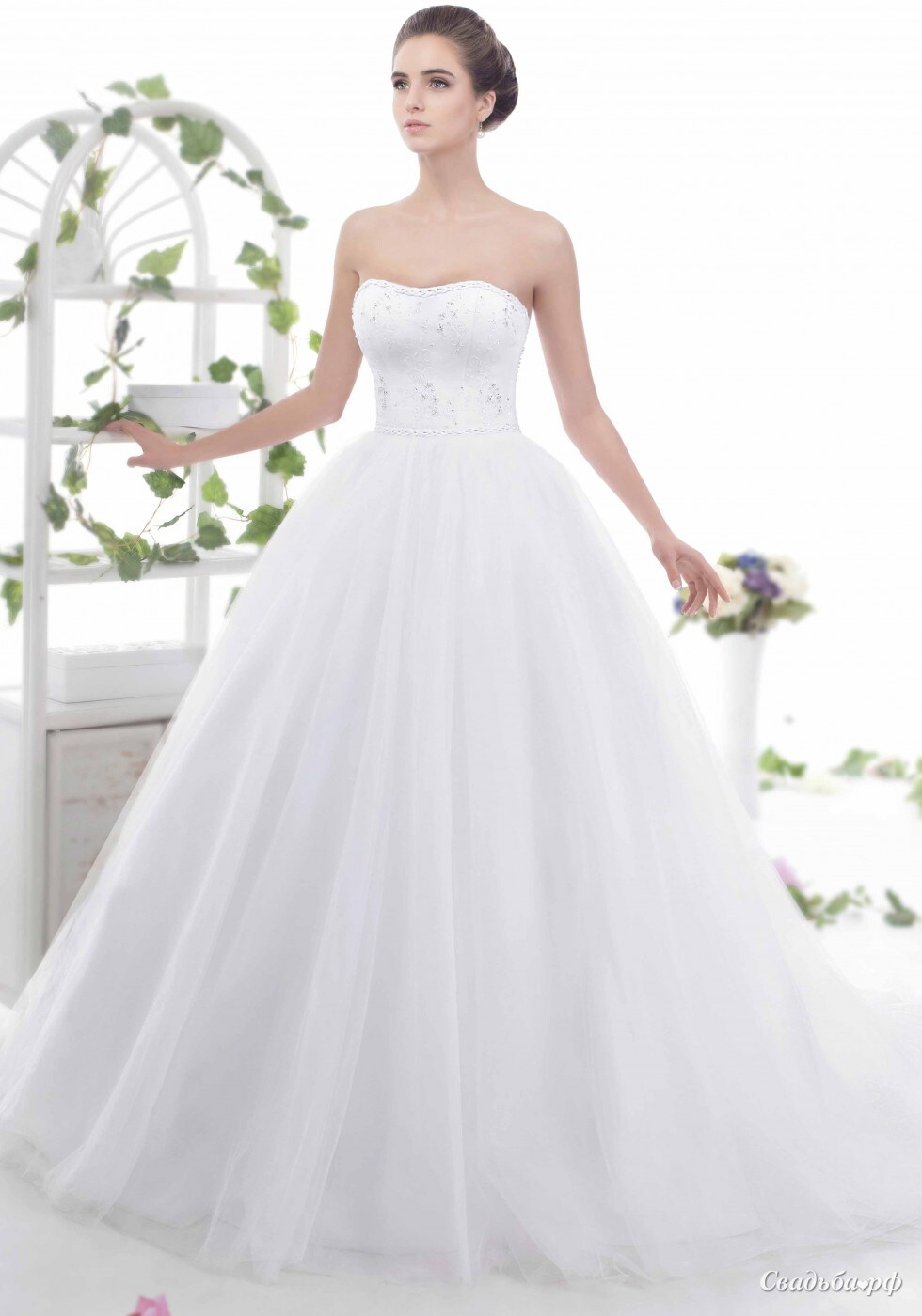 Романтичное свадебное платье в пышном стиле. Облегающий корсет акцентирует внимание на достоинствах фигуры. Пышная юбка с оригинальными складками придаёт образу воздушность и весеннюю свежесть.
