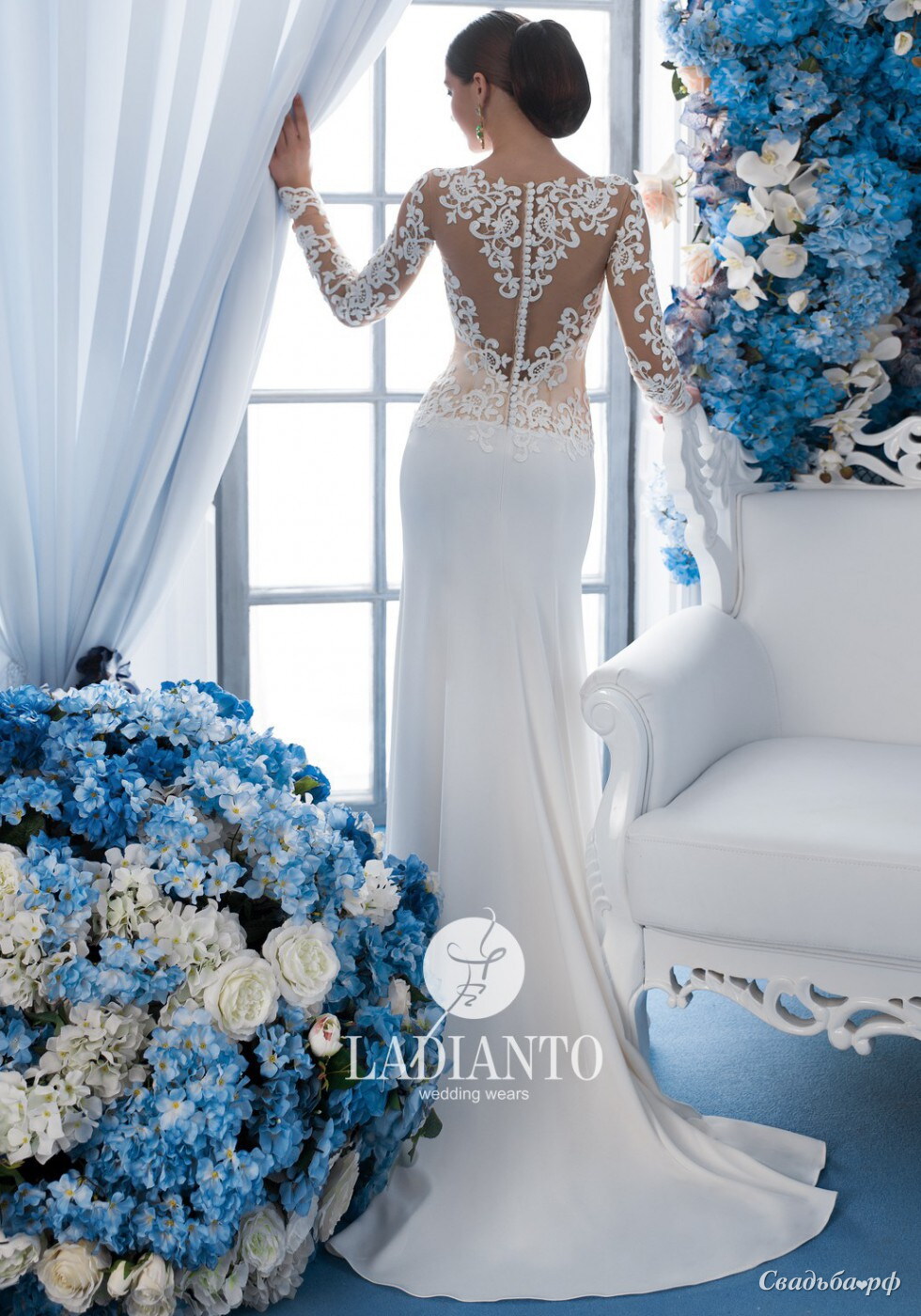 Свадебное платье силуэта русалка. Юбка из крепа. Корсет декорирован кружевом. Спинка и рукава на пуговках.