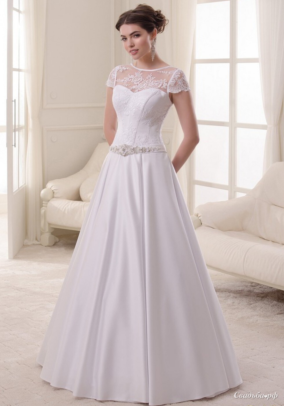 Восхитительное свадебное платье А-силуэта. Модель поражает своей элегантностью и лаконичностью форм. Корсет украшен оригинальным кружевом, закрывающим зону декольте и спинку, и дополнен маленькими рукавами. Талия акцентирована широким атласным поясом, расшитым бисером и стеклярусом. Стильный наряд создан для настоящей леди.