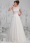 Элегантное свадебное платье с закрытым декольте придаёт образу весеннюю свежесть и игривость. Корсет украшен кружевом, что зрительно увеличивает бюст и выгодно подчёркивает талию. На спинке глубокий V-образный вырез. Слегка расклешенная юбка со складками смотрится легко и торжественно. Стильный и безукоризненный наряд А-силуэта.