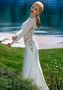 Нежное силуэтное свадебное платье с шикарными кружевными вставками по бокам и на спине. Глубокий вырез на спинке декорирован гипюровым кружевом с цветочным орнаментом. Зона декольте и манжеты рукавов украшены роскошной расшивкой кристаллами Сваровски. Наряд создает романтичный и загадочный образ.