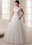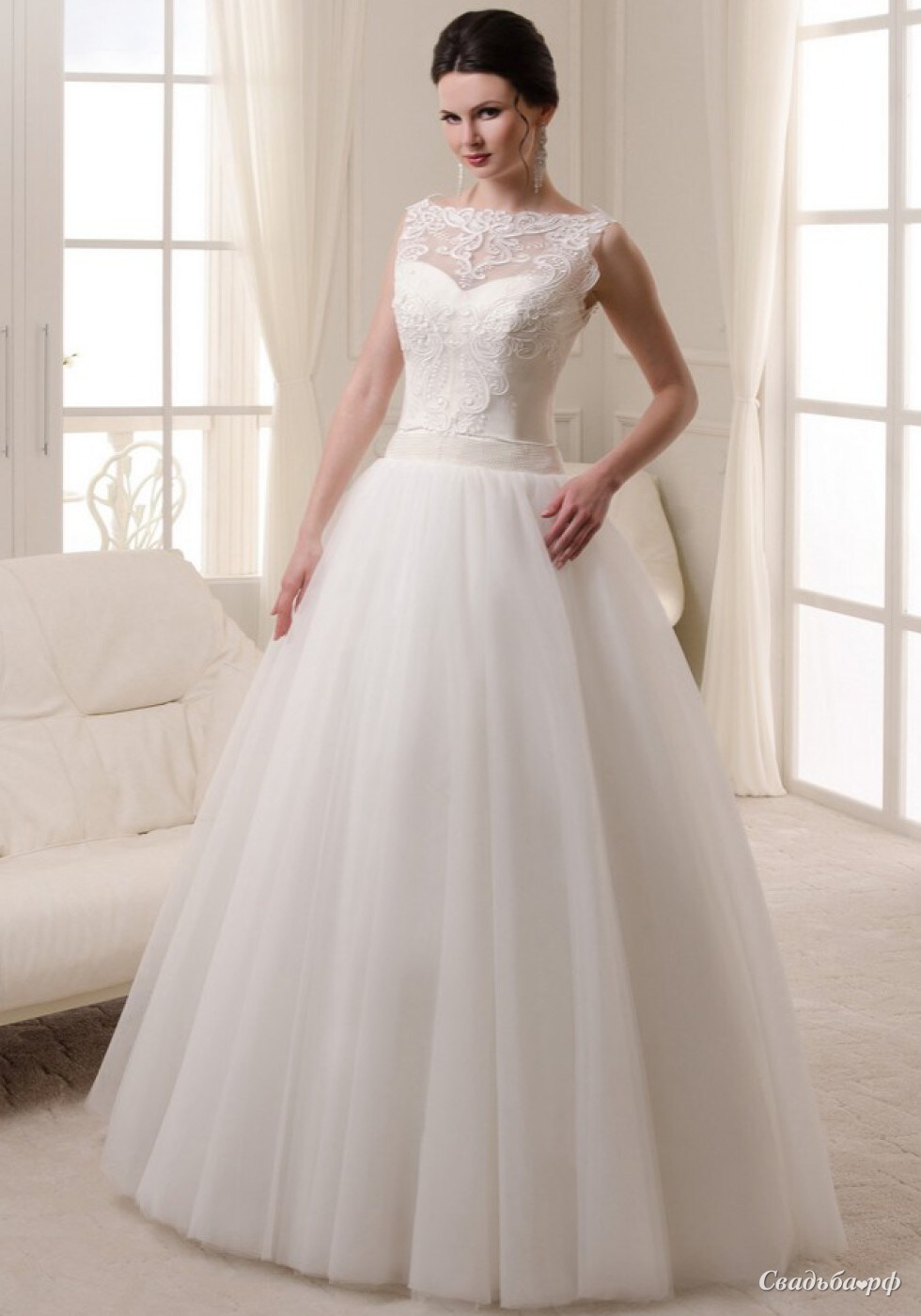 Потрясающее закрытое свадебное платье выгодно подчеркивает фигуру, скрывая небольшие недостатки. Корсет украшен кружевом, закрывающим зону декольте и спину. Элегантные пуговки декорируют спинку. Простая пышная юбка из фатина завершает эффектный образ.