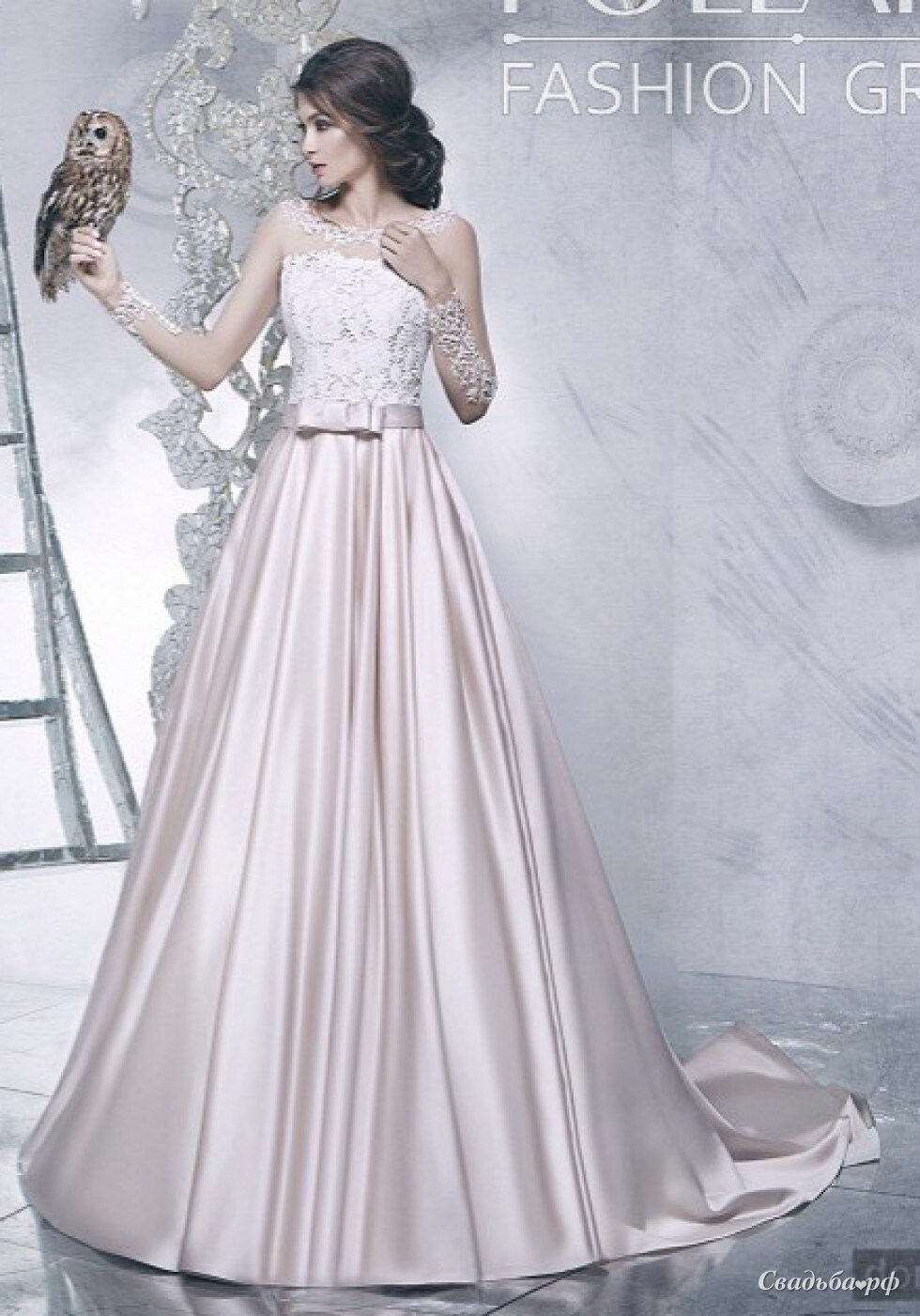 Великолепное свадебное платье из нежного атласа придётся по вкусу самым стильным и романтичным невестам. Корсет украшен изысканным кружевом. Зона декольте и руки закрыты полупрозрачной тканью, декорированной сверкающей вышивкой по горловине и лёгким кружевом на рукавах. Длинная юбка из розового атласа струится до самого пола. Наряд зрительно вытягивает силуэт.