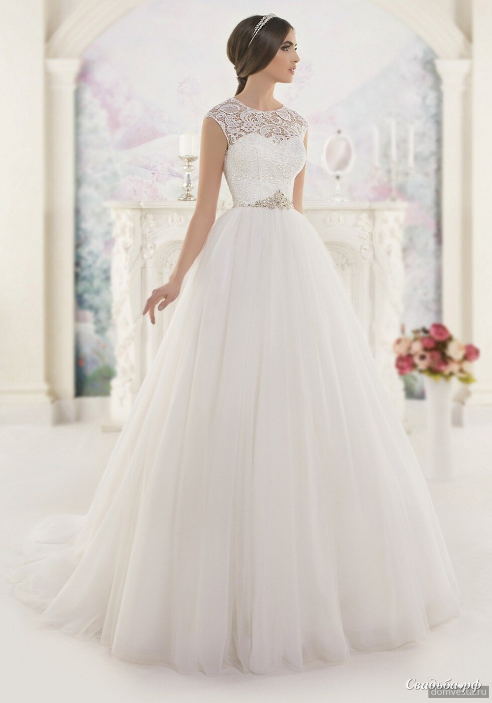 Свадебное платье с изящным закрытым кружевным корсетом. Тонкое кружево создает невинный и чистый образ. На спинке округлый вырез и шнуровка. Пышная юбка переходит в легкий шлейф средней длины. Модель очень нежная и одновременно стильная.