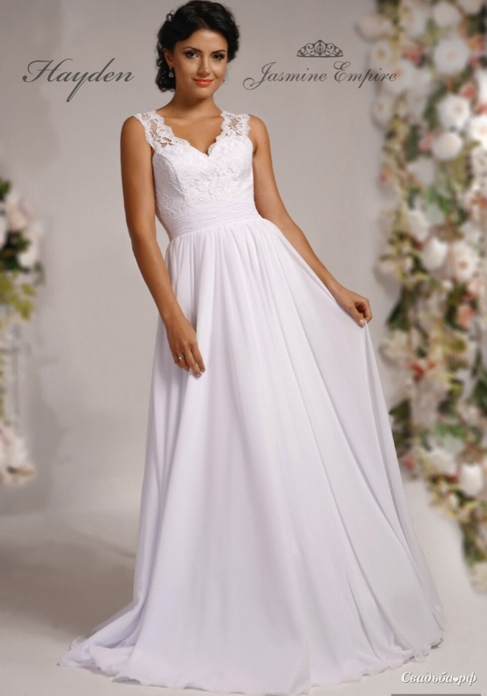 Свадебное платье в греческом стиле с кружевным лифом и широкими кружевными бретелями. Спинка модели полностью закрыта красивым кружевом, застегивающимся на маленькие пуговки. Талия украшена широким шифоновым поясом.