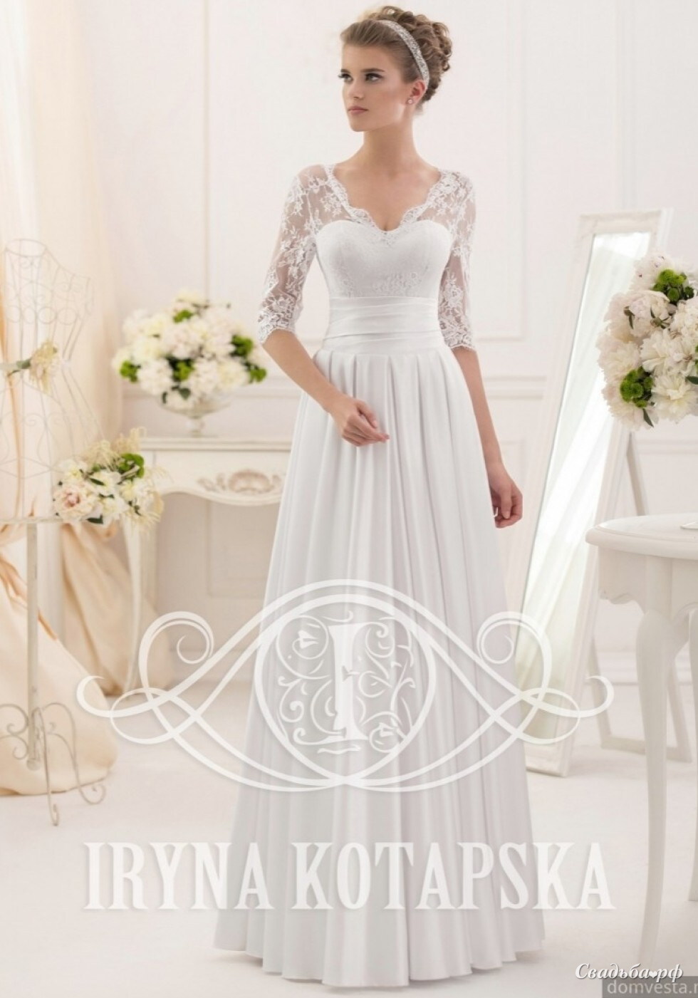 Элегантный свадебный наряд с прямой юбкой из мягкого шелкового атласа и кружева. Сердцевидный лиф украшен кружевами и дополнен полупрозрачными рукавами. Летящая юбка со складками придает образу изящество и легкость. Эта модель подойдет корпулентным и беременным девушкам.