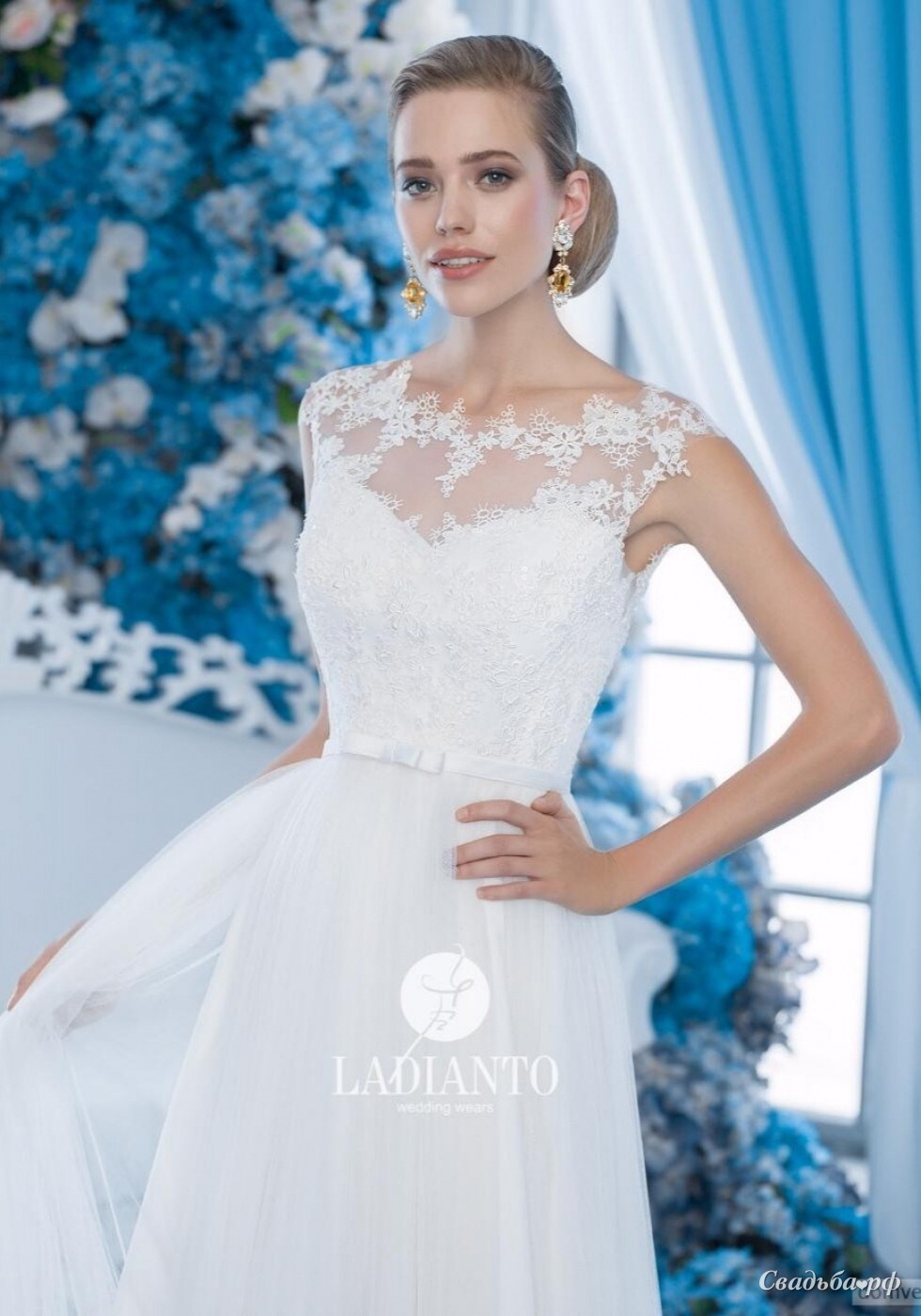 Платье А-силуэта с корсетом, отделанным кружевными аппликациями и пайетками. Легкая юбка из евросетки. Спинка на европейской пуговичной застежке. Без шлейфа.