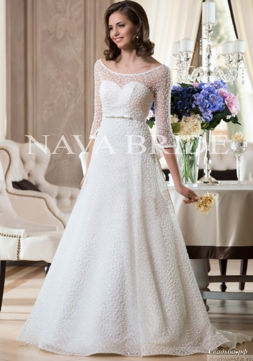 Платье А-силуэта с закрытым верхом и с рукавами ¾. На лифе сердцеобразный вырез. Все платье расшито роскошным жемчугом. На талии тонкий пояс с бантиком. Корсет на шнуровке. Спинка наполовину закрыта, с изысканным округлым вырезом.