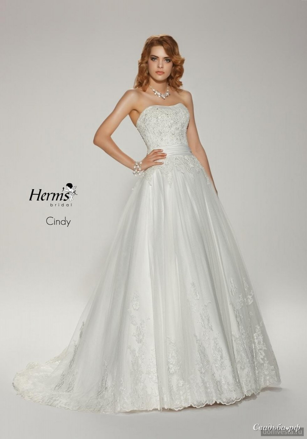 Романтичное свадебное платье в стиле "Принцесса". Модель расшита нежным кружевом, атласный пояс, подчеркивающий линию талии, придает фигуре хрупкость, а образу - утонченность.