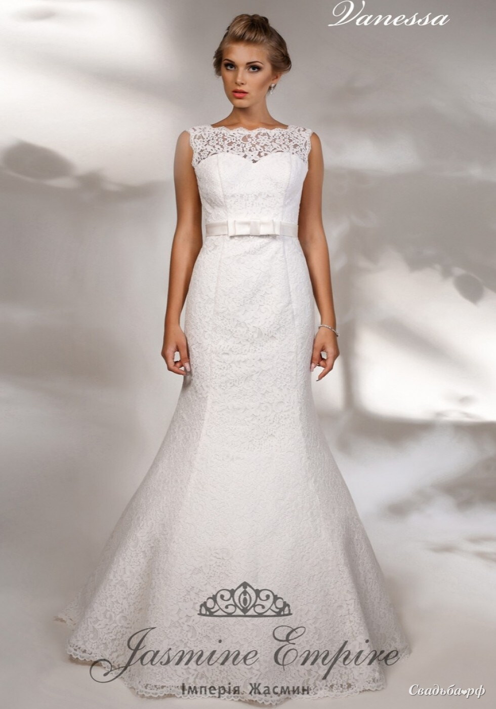 Кружевное платье силуэта рыбка с закрытым верхом и с короткими рукавами. Вырез в зоне декольте в форме сердечка. На спине V-образный вырез и маленькие милые пуговички. На талии атласный пояс с двойным бантиком.