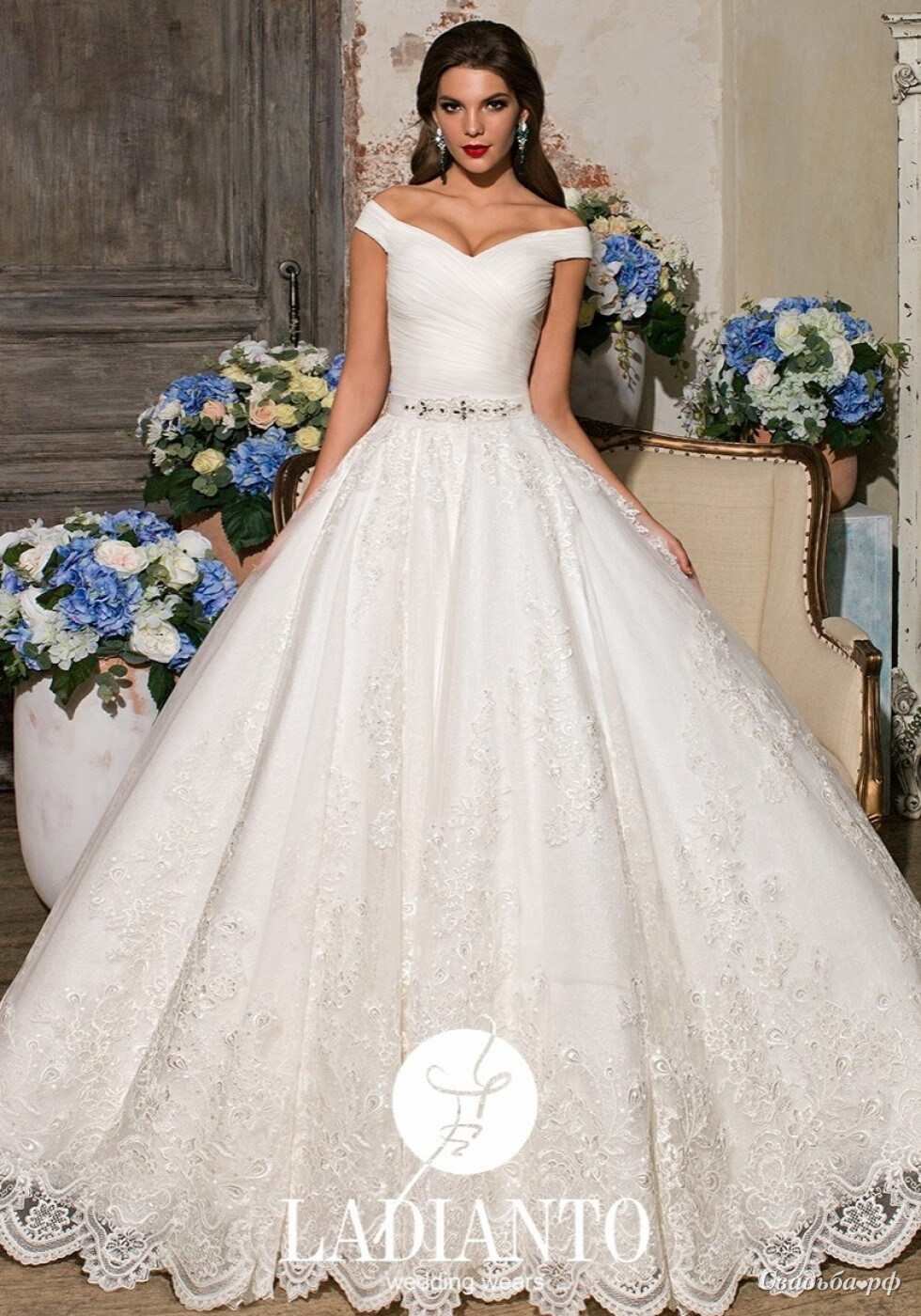 Потрясающее свадебное платье с пышной юбкой, переходящей в небольшой шлейф, из еврофатина. Шикарный корсет задрапирован мягким еврофатином и дополнен оригинальными приспущенными лямочками. На талии пояс с нашивкой. Юбка расшита невероятно красивыми кружевными аппликациями. Низ украшен королевским кружевным кантом в виде пера жар-птицы.