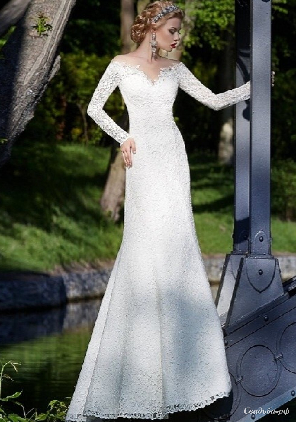 Свадебное платье облегающего силуэта из кружева. Очень нежная и одновременно шикарная модель из потрясающей ткани. Глубокий V-образный вырез обрамлен цветочными узорами, что выгодно подчеркивает грудь. Роскошная спинка с маленькими пуговками придает наряду изюминку.